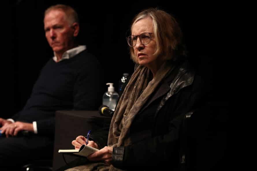 Professor Mary O’Kane (right) and Mick Fuller listen during the NSW flood inquiry in Lismore. Photograph: Jason O’Brien/AAP
