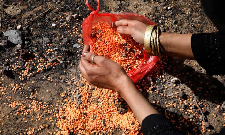 A displaced Yemeni woman with emergency food aid on the outskirts of Sana'a, Yemen. Photograph: Yahya Arhab/EPA