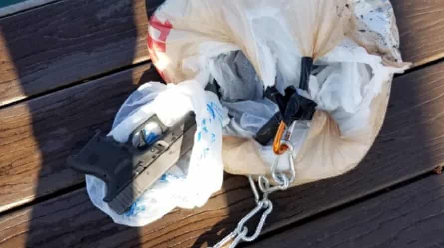 Police recovered the drone with bucket truck, and that a plastic shopping bag was attached with metal carabiners and electrical tape.