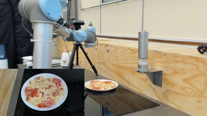 To imitate the human process of chewing and tasting in their robot chef, the researchers attached a conductance probe, which acts as a salinity sensor, to a robot arm. They prepared scrambled eggs and tomatoes, varying the number of tomatoes and the amount of salt in each dish.