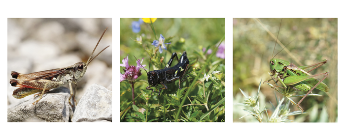 IMAGE: THREE GRASSHOPPER SPECIES WHOSE FEEDING BEHAVIOUR WAS STUDIED (FROM LEFT): THE GRAVEL GRASSHOPPER, THE GREEN MOUNTAIN GRASSHOPPER FEEDING ON A SPECIES OF BEDSTRAW, AND THE WART-BITER, WHICH ALSO OCCURS IN LOWER FRANCONIA. (PHOTOS: view more