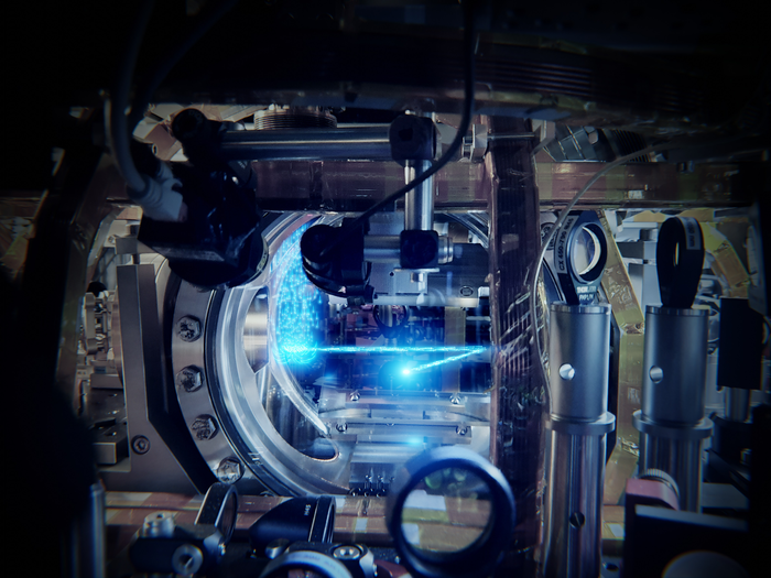 Peer-Reviewed PublicationIMAGE: THE CENTRAL PART OF THE EXPERIMENT IN WHICH THE COHERENT MATTER WAVES ARE CREATED. FRESH ATOMS (BLUE) FALL IN AND MAKE THEIR WAY TO THE BOSE-EINSTEIN CONDENSATE IN THE CENTER. IN REALITY, THE ATOMS ARE NOT VISIBLE TO THE NAKED EYE. IMAGE PROCESSING BY SCIXEL. view more