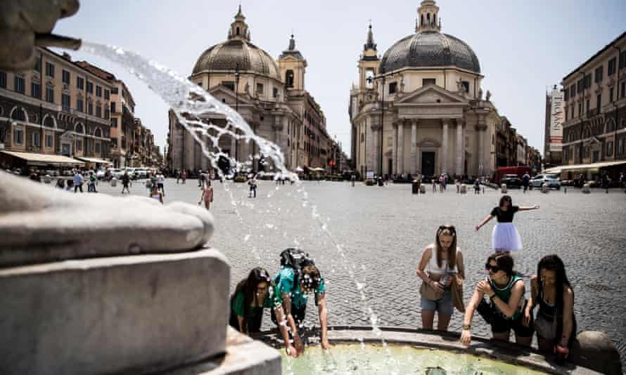 People cool off by a fountain in Piazza del Popolo, Rome, as Anticyclone Scipio raises temperatures in Italy.