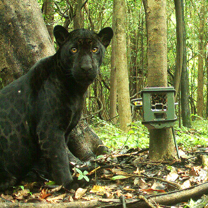 A black panther (Panthera onca)– melanic individual – spotting one of the cameras trap in the floodplain várzea forests of Mamirauá Sustainable Development Reserve (MSDR), Central Amazonia
