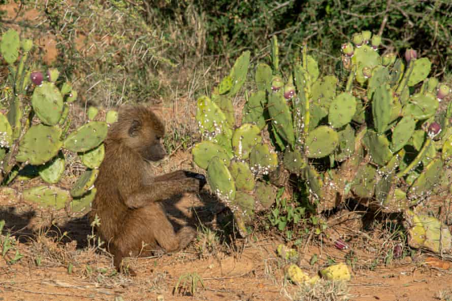 Baboons cleverly roll cactus fruits in the dirt to brush off the thorns and fine hairs that can cause infections and digestive issues.