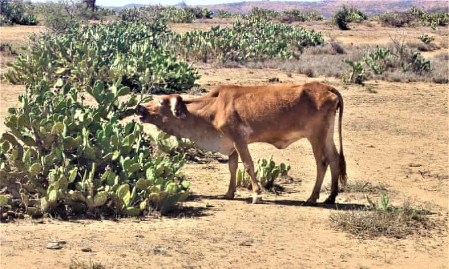 This becomes apparent at the home of George Sintaroi, a few kilometres down the road. His emaciated herd of cows includes some too thin to stand for long. Like Saikong, Sintaroi, 68, lost at least 20 cows through eating the plant. “I am not sure how long these ones will stay alive,” he says. “Look at this field. There is not a blade of grass, but bare earth. Opuntia is all around, and even the rains might not be of much help.” Sintaroi is trying to hold on to his remaining flock, competing for the meagre resources with wild animals, including a herd of elephants foraging near his village.