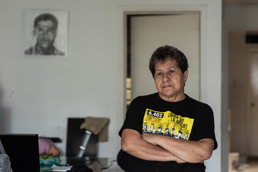 /Zoraida Muñoz is part of a group of mothers denouncing extrajudicial killings known as "false positives." The mothers say their sons were kidnapped by the Colombian army, killed and disguised as guerrillas to add to a fictitious war record. The mother of Jonny Duvián, who was killed in 2008, Muñoz spoke at the hearing in Ocaña. Here she is photographed at her home in Bogotá, Colombia, on May 18.