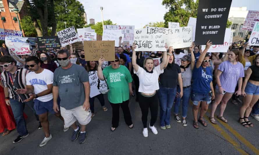 Protesters get ready to march to the governor’s mansion in Des Moines, Iowa. Photograph: Charlie Neibergall/AP
