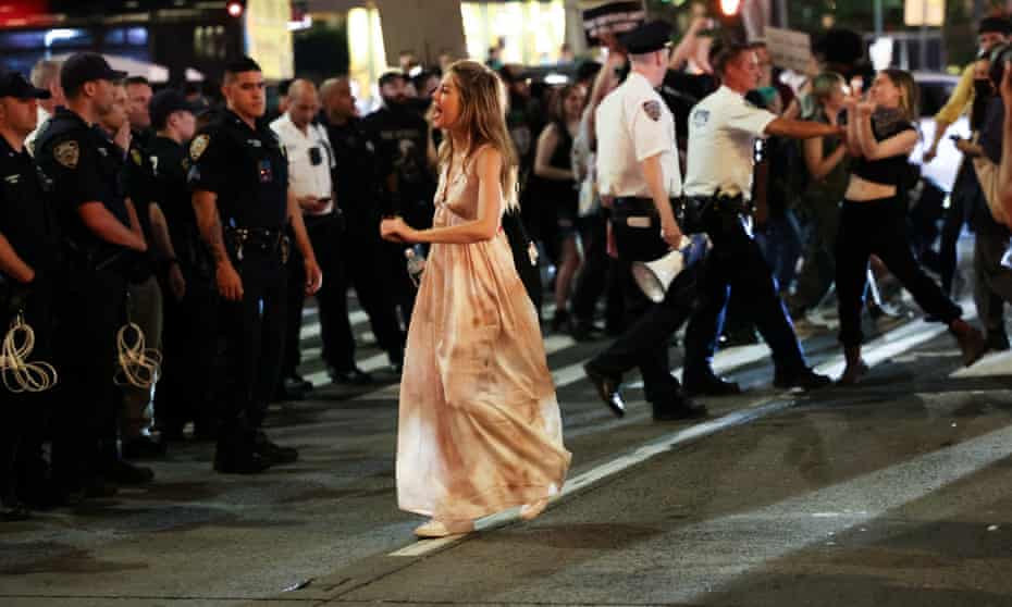 New York police clear people protesting against the supreme court’s Roe v Wade decision from the street.