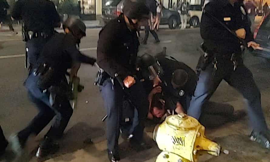 The Los Angeles police department issued a statement to the Guardian: “The LAPD is aware of the video clip of a woman being pushed. The force used will be evaluated against the LAPD’s policy and procedure.