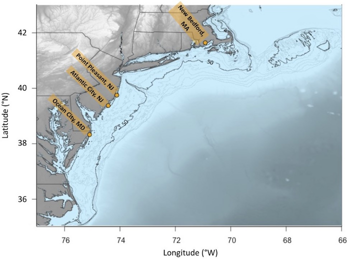 The studies, funded by the U.S. Bureau of Ocean Energy Management, also determined the locations of the most vulnerable fleets and associated processors. Topping the list are fleets based in Atlantic City. The least affected port in the simulations was New Bedford, Mass.