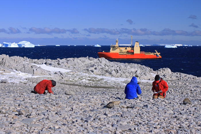 IMAGE: SAMPLE COLLECTION ON THE LINDSEY ISLANDS, PINE ISLAND BAY, ANTARCTICA. UNIVERSITY OF MAINE GRADUATE STUDENTS SCOTT BRADDOCK AND MEGHAN SPOTH ARE COLLECTING RADIOCARBON SAMPLES WITH HELP FROM ELIZABETH RUSH (BROWN UNIVERSITY). US NATIONAL SCIENCE FOUNDATION RESEARCH VESSEL, NATHANIEL B. PALMER IS IN THE BACKGROUND. view more