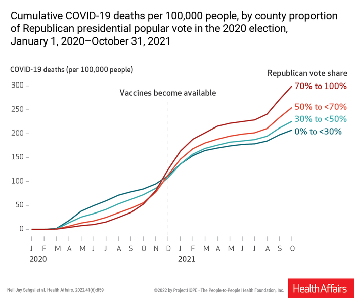 CREDIT: NEIL JAY SEHGAL ET AL EXHIBIT 2 FROM HEALTH AFFAIRS JUNE 2022 PAPER THE ASSOCIATION BETWEEN COVID-19 MORTALITY AND THE COUNTY-LEVEL PARTISAN DIVIDE IN THE UNITED STATES