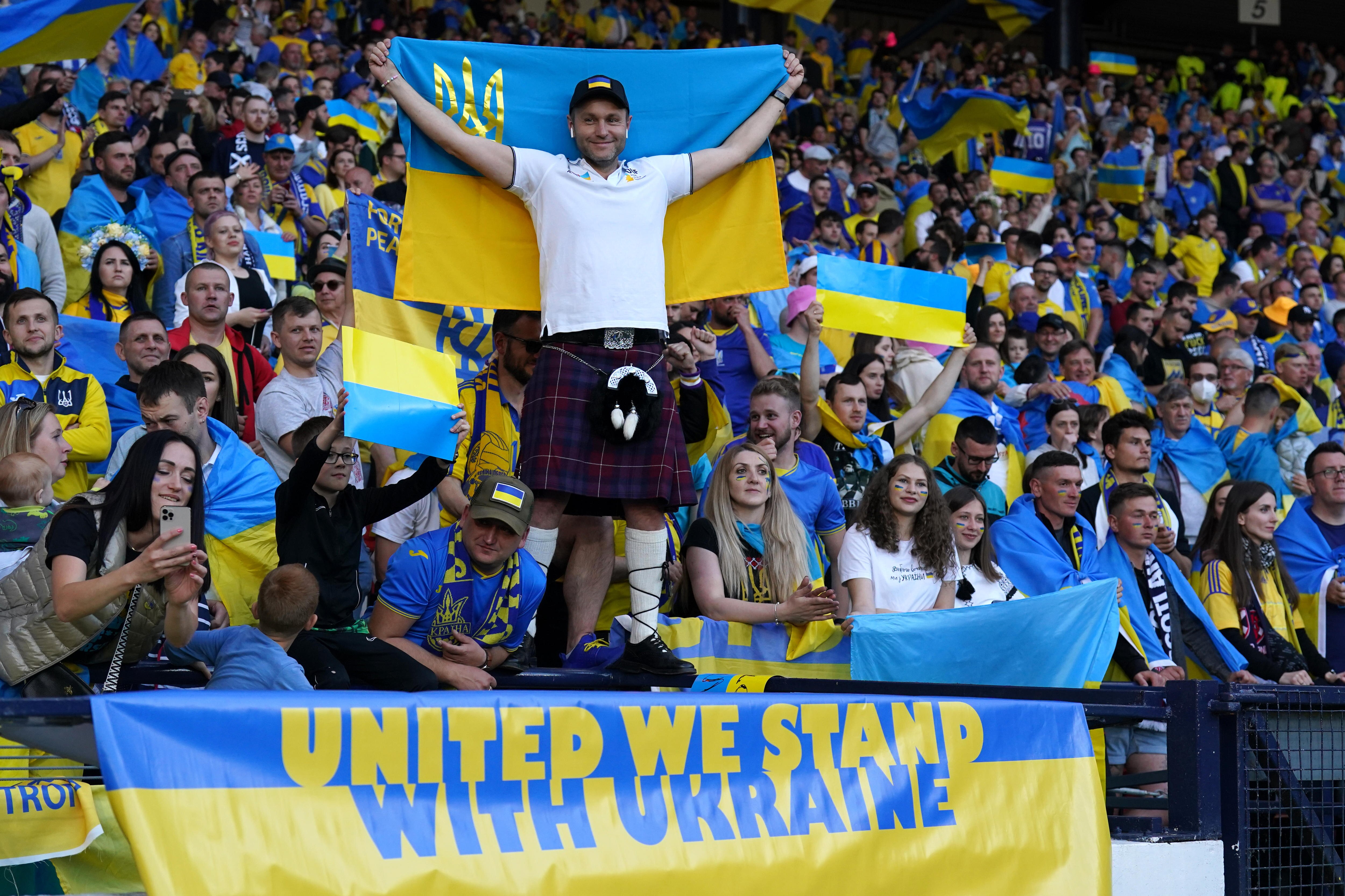 A Ukrainian fan holds his flag aloft while wearing a kilt at Hampden Park, Glasgow.