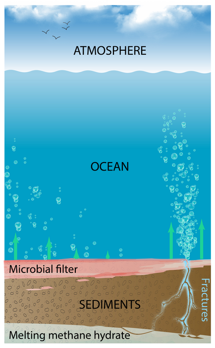 IMAGE: METHANE LEAKS THROUGH THE NATURAL MICROBIAL FILTER WHEN THE METHANE TRANSPORT SUDDENLY INCREASES IN RESPONSE TO WARMING OCEANS AND SUBSEQUENT METHANE HYDRATE MELTING. THE METHANE EMISSIONS DEPEND ON THE SEDIMENT TYPE; IN FINE-GRAINED SEDIMENTS SUCH AS CLAY, FRACTURES FORM THAT LEAD TO HIGHER EMISSIONS. ILLUSTRATION: CHRISTIAN STRANNE view more