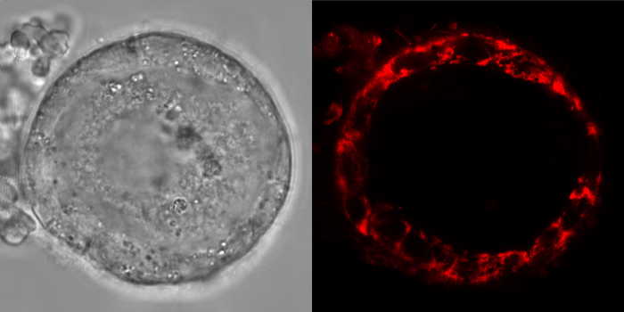 Peer-Reviewed PublicationIMAGE: LIVE CELL IMAGING OF HUMAN FOLLICLE, SHOWING GRANULOSA CELLS ON THE OUTER LAYER, WHICH SUPPORT THE OOCYTE, CONTAINED WITHIN. THE ACTIVITY OF REACTIVE OXYGEN SPECIES IS SHOWN IN RED. THE RESEARCHERS OBSERVED ROS ACTIVITY IN THE GRANULOSA CELLS BUT IT IS VIRTUALLY ABSENT IN THE OOCYTE. view more