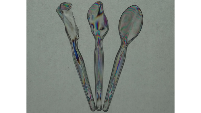 Transparent plastic cutlery, for instance, provide a classic demonstration, where localized strain in the polymer structure results in differential birefringence, observable through a polarization gate. Likewise, somewhat randomly folded kitchen cling wrap, gift basket film, and layered adhesive tape can form intricate images reminiscent of stained-glass windows.