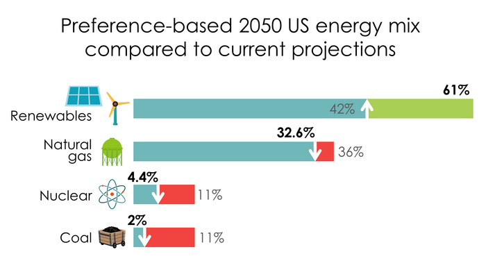 Energy plan for 2050 based on consumer preferences and future demographics of the US population includes 50% more electricity derived from renewable sources than current projections