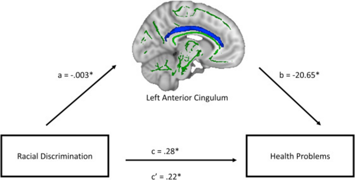 Women who experienced more racial discrimination displayed lower FA in select brain tracts including the anterior cingulum bundle and the corpus callosum, which connects the two hemispheres of the brain. In addition, the structural integrity of these two specific tracts mediated the relationship between racial discrimination and medical disorders in these women.