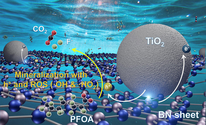Peer-Reviewed PublicationIMAGE: ILLUSTRATION SHOWING HOW A COMPOSITE MATERIAL CONTAINING SHEETS OF BORON NITRIDE (LATTICE OF BLUE AND SILVER BALLS) AND NANOPARTICLES OF TITANIUM DIOXIDE (GRAY SPHERES) USES LONG-WAVE ULTRAVIOLET ENERGY IN SUNLIGHT TO PHOTOCATALYSE THE BREAKDOWN OF PFOA INTO CARBON DIOXIDE, FLUORINE AND MINERALS. view more