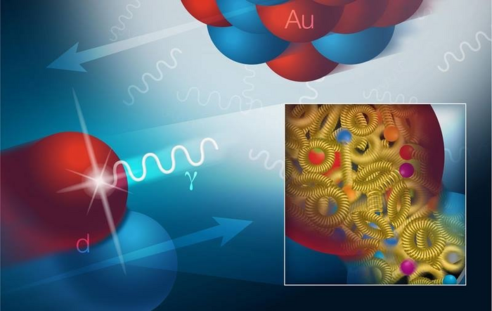 image: In ultra-peripheral collisions between gold (Au) ions and deuterons (d), photons (γ) surrounding the fast-moving ions interact with gluons (yellow coils) to reveal their distribution within the deuteron. view more