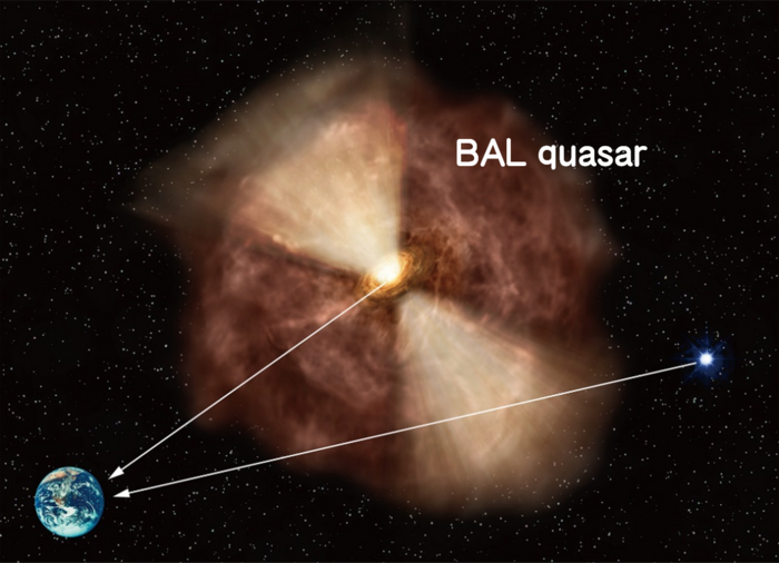 IMAGE: USING THE SPECTRUM OF ANOTHER QUASAR IN THE BACKGROUND, THE IONIZATION LEVEL OF INTERGALACTIC GAS AROUND A FOREGROUND BAL QUASAR IN THE TRANSVERSE DIRECTION CAN BE EXAMINED. view more