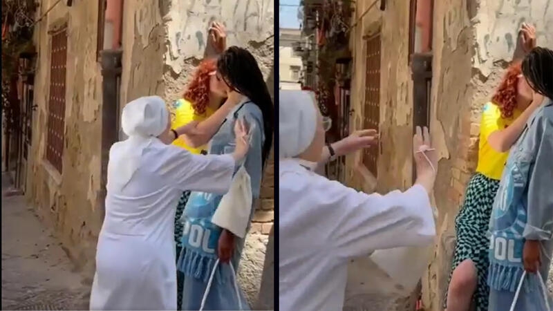 A video that has gone viral online shows an Italian nun, wearing white, pulling apart two girls who were seen kissing for a photoshoot in Naples, Italy.