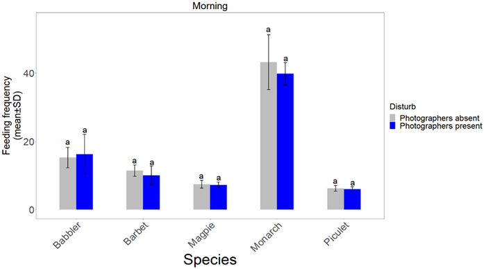 IMAGE: THE FEEDING FREQUENCY OF FIVE BIRD SPECIES IN THE MORNING WITH PHOTOGRAPHERS ABSENT (GREY COLUMN) AND PRESENT (BLUE COLUMN). view more