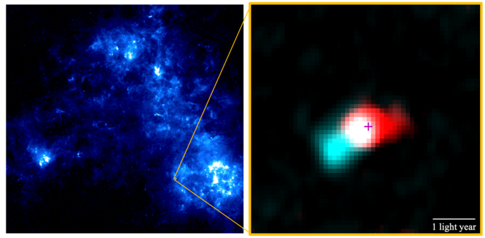 IMAGE: (LEFT): WIDE-FIELD FAR-INFRARED IMAGE OF THE SMALL MAGELLANIC CLOUD OBTAINED WITH THE HERSCHEL SPACE OBSERVATORY. (RIGHT): AN IMAGE OF THE MOLECULAR OUTFLOW FROM THE BABY STAR Y246. CYAN AND RED COLORS SHOW THE BLUESHIFTED AND REDSHIFTED GAS OBSERVED IN CARBON MONOXIDE EMISSION. THE CROSS INDICATES THE POSITION OF THE BABY STAR. view more