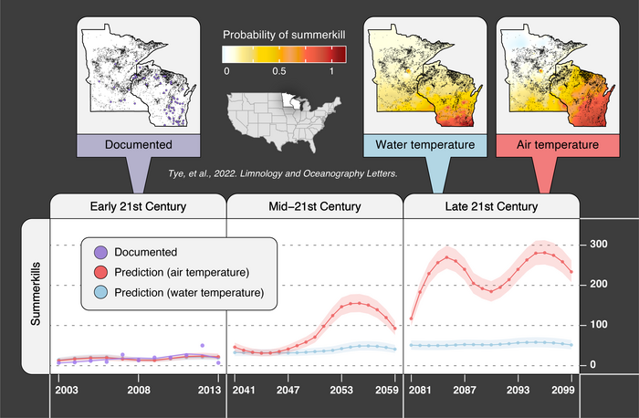 Finally, with a historical baseline established, the team used air and water temperature-based models to predict frequencies of future summerkills.
