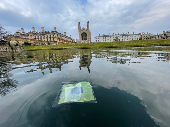 IMAGE: A FLOATING ARTIFICIAL LEAF - WHICH GENERATES CLEAN FUEL FROM SUNLIGHT AND WATER - ON THE RIVER CAM NEAR KING'S COLLEGE CHAPEL IN CAMBRIDGE, UK. view more