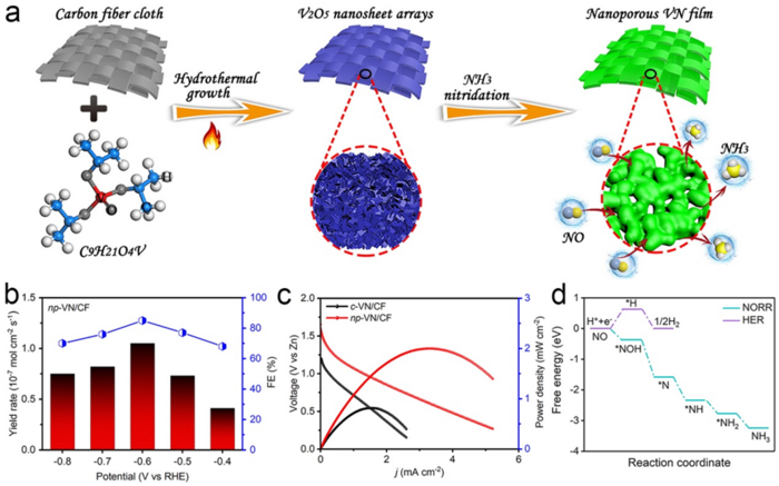 The researchers explored NO reaction reduction (NORR) to ammonia using the synthesis of nanoporous vanadium nitride (VN) film supported on carbon fiber cloth (written as np-VN/CF). They tested the new method, the novelty of which lies with using existing materials of VN film in a new way and for a new purpose, with a zinc-nitrogen oxide battery.
