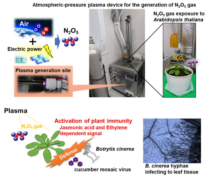 A genetic analysis revealed that the gas specifically activated the jasmonic acid and ethylene signaling pathways and appeared to lead to the synthesis of antimicrobial molecules, which Ando said may have contributed to the observed disease resistance. "Dinitrogen pentoxide gas can be used to activate plant immunity and control plant diseases," Ando said. "Through plasma technology, the gas can be produced from air and electricity, without special materials. The gas can also be converted to nitric acid, when dissolved in water, and used as a fertilizer for plants. This technology can contribute to the construction of a sustainable agricultural system as a clean technology with minimal environmental impact."