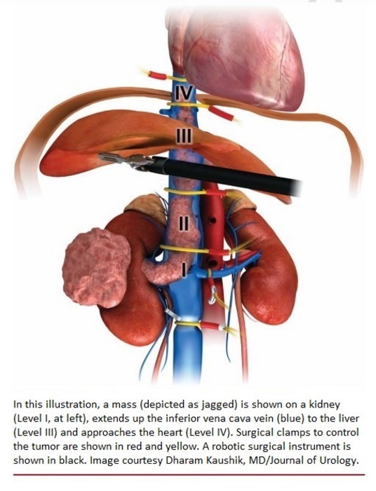 IMAGE: IN THIS ILLUSTRATION, A MASS (DEPICTED AS JAGGED) IS SHOWN ON A KIDNEY (LEVEL I, AT LEFT). THE TUMOR EXTENDS UP THE INFERIOR VENA CAVA VEIN (BLUE) TO THE LIVER (LEVEL III) AND APPROACHES THE HEART (LEVEL IV). SURGICAL CLAMPS TO CONTROL THE TUMOR ARE SHOWN IN RED AND YELLOW. A ROBOTIC SURGICAL INSTRUMENT IS SHOWN IN BLACK. IMAGE COURTESY DHARAM KAUSHIK, MD/JOURNAL OF UROLOGY. view more