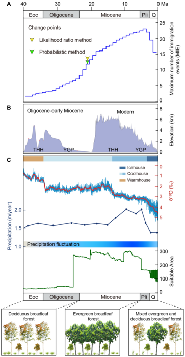 By modeling variations of distribution ranges of East Asian subtropical evergreen broad-leaf forests over time and analyzing paleoclimate data from 19 fossil sites, the researchers proposed that biotic colonization of subtropical East Asian caves during the Neogene occurred in conjunction with large-scale, seasonal climatic changes and the evolution of local forests.