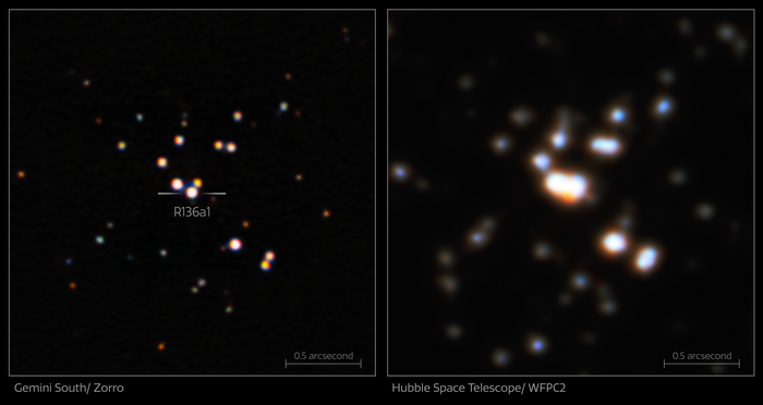 This comparison image shows the exceptional sharpness and clarity of the Zorro imager on the 8.1-meter Gemini South telescope in Chile (left) when compared to an earlier image taken with the NASA/ESA Hubble Space Telescope (right). The new Gemini South image allowed astronomers to clearly distinguish the star R136a1 from its nearby stellar companions, providing the data needed to reveal that – while still the most massive star known in the Universe – it is less massive than previously thought.