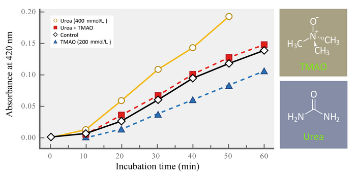 IMAGE: THE EFFECTS OF TMAO AND UREA ON THE RATE OF LABELING OF SULFHYDRYL GROUPS OF GLUTAMATE DEHYDROGENASE BY THE REAGENT 4-CHLORO-7-NITROBENZOFURAZAN (NBF-CL). CONTROL MIXTURES HAD NEITHER TMAO NOR UREA. THE STRUCTURES OF TMAO AND UREA ARE SHOWN TO THE RIGHT OF THE GRAPH. (FIGURE REDRAWN AFTER YANCEY PH, SOMERO GN (1979) COUNTERACTION OF UREA DESTABILIZATION OF PROTEIN STRUCTURE BY METHYLAMINE OSMOREGULATORY COMPOUNDS OF ELASMOBRANCH FISHES. BIOCHEM J 182:317–323) view more