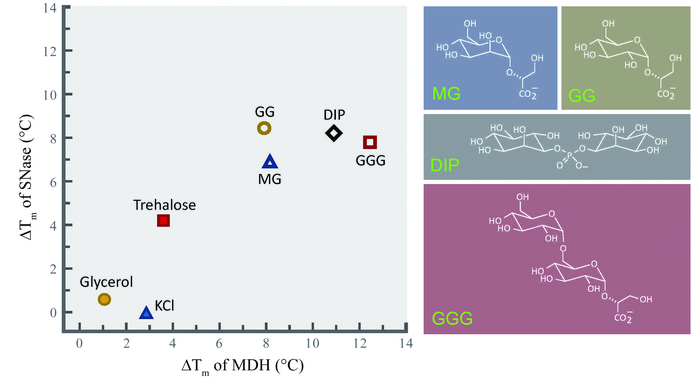 Fig. 3 The efficacies of different organic osmolytes in stabilizing the structures of malate dehydrogenase (MDH) and staphylococcal nuclease (SNase). Osmolyte concentrations were 0.5 mol/L except for GGG, which was 0.4 mol/L. Chemical structures of the extremolytes, MG (mannosylglycerate), GG (glucosylglycerate), DIP (di-myo-inositol 1-3’phosphate) and GGG (α(1,6)glucosyl-α(1,2) glucosylglycerate) are shown to right of the graph. (Figure modified after Lamosa PM, Rodrigues V, Gonçalves LG, Carr J, Ventura R, Maycock C, Raven ND, Santos H (2013) Organic solutes in the deepest phylogenetic branches of the Bacteria: identification of α(1–6)glycosyl-α(1–2)glucosylglycerate in Persephonella marina. Extremophiles 17:137–146)