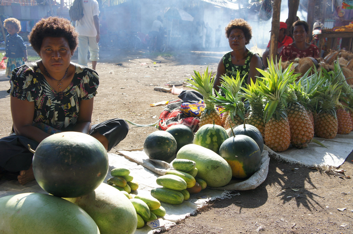 IMAGE: WOMEN SELLING DIFFERENT PRODUCE INCLUDING WATERMELONS, CUCUMBERS AND PINEAPPLES IN A LOCAL MARKET IN PAPUA NEW GUINEA. view more