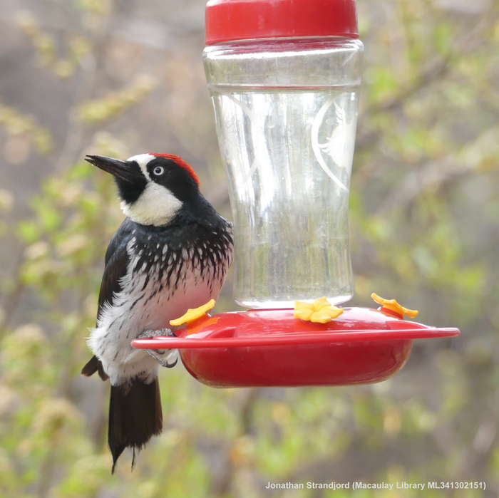Acorn woodpeckers (Melanerpes formicivorus) often visit hummingbird feeders to drink sugar solutions.