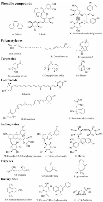 According to previous studies, the main nutraceuticals in Apiaceae plants include polyphenolic compounds, polyacetylenes, and terpenoids. Phenolic compounds contribute to the nutritional qualities of vegetables and medicinal plants, and the antioxidant activity of many Apiaceae plants has also been attributed primarily to phenolic compounds. Several polyacetylenes isolated from Apiaceae plants have high toxicity to bacteria, fungi, and mammalian cells, as well as neurotoxicity, inhibitory effects on platelet aggregation, and potential to cause allergic skin reactions. Some terpenoids are specifically distributed in Apiaceae plants. The antioxidant effects of terpenoids have led to their use in treating some diseases. Vegetables in the Apiaceae family can also produce many secondary metabolites such as carotenoids, anthocyanins, terpenes, and dietary fiber. Carotenoids are natural pigments that are widely distributed in photosynthetic organisms and may provide health benefits. Anthocyanins protect plants from UV radiation, contribute to plant adaptation to abiotic and biotic stresses, and delay plant senescence. Terpenes are an important group of secondary metabolites and are widely distributed in many plants. The plant cell wall, which contains lignin and cellulose, is the source of most dietary fiber in plants. Hormones play important roles in lignin biosynthesis in celery and carrot, and transcription factors are important regulators of lignin biosynthesis in these species. Hypoxia caused by elevated CO2 concentration can also affect their lignin content.