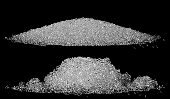 We often encounter divided materials that are composed of small particles — think sand on the beach, soil, snow and dust — that can be affected by more than just frictional forces, sharing some additional cohesive forces with their neighbors. While cohesion acts only between a particle and its immediate neighbors, it also produces macroscopic effects; for instance, causing divided bits of material to aggregate and adding additional strength to the composite. Cohesion is what causes powders, such as flour, to clump and enables us to make castles on the beach by adding a small amount of water to dry sand.