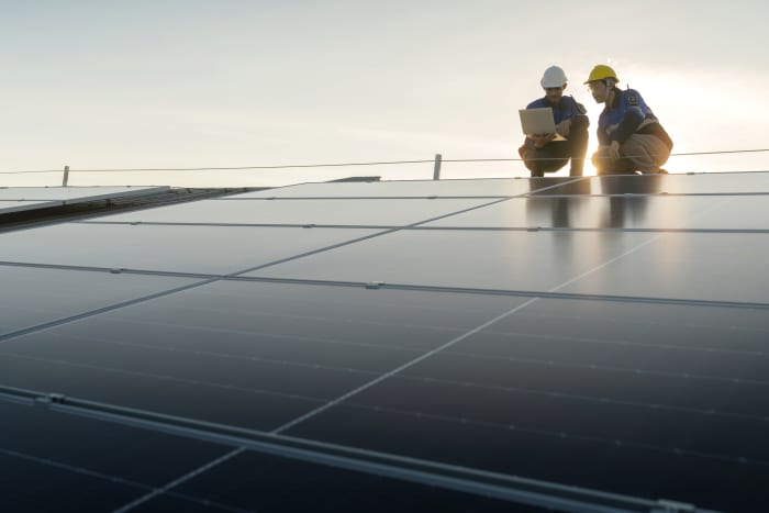 A specialist technician and an engineer check the solar panels on a factory rooftop.