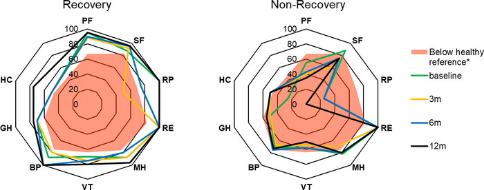IMAGE: HEALTH-RELATED QUALITY OF LIFE IN R- AND NR-GROUP AT BASELINE, THREE, SIX, AND TWELVE MONTHS AFTER ADMISSION, WITH VISUAL INDICATION OF HEALTHY REFERENCE VALUE PER DOMAIN OF THE RAND-36 QUESTIONNAIRE (ABBREVIATIONS: PF, PHYSICAL FUNCTIONING; SF, SOCIAL FUNCTIONING; RP, ROLE PHYSICAL; RE, ROLE EMOTIONAL; MH, MENTAL HEALTH; VT, VITALITY; BP, BODILY PAIN; GH, GENERAL HEALTH PERCEPTION; HC, HEALTH CHANGE). view more