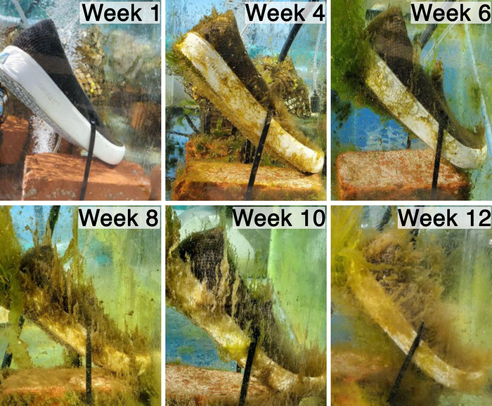 A sustainable Blueview shoe is shown biodegrading in seawater after being submerged for 12 weeks.