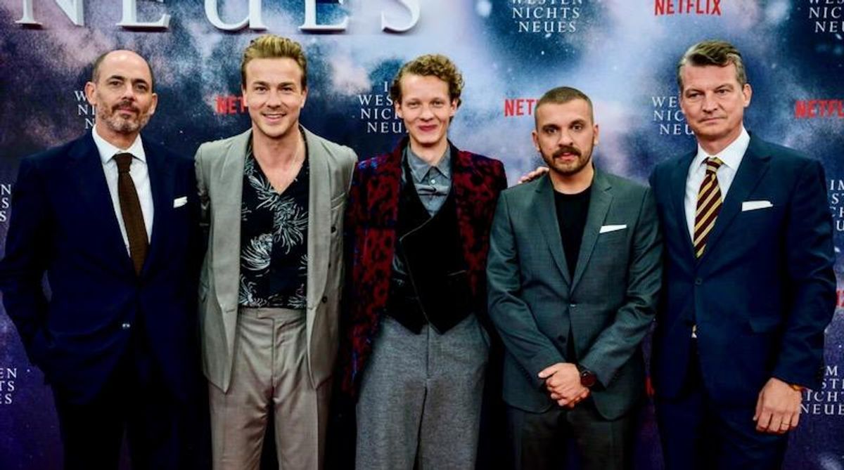 Although director Edward Berger (Far Left) declined to discuss the war raging in Ukraine, reviewers noted the obvious parallels to a story about a soldier fighting for a nationalist lie