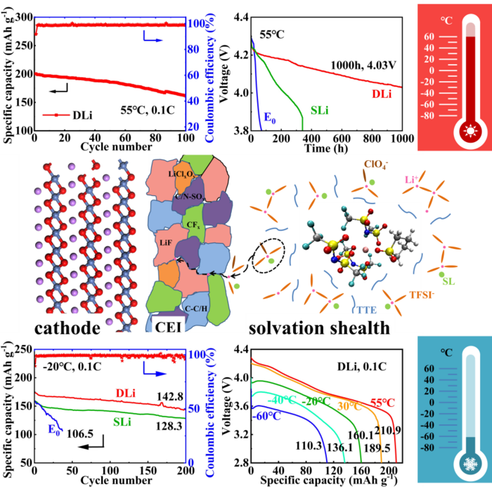 “The diluted high concentration sulfolane-based electrolyte with lithium perchlorate additive realizes the wide-temperature application in high voltage cells. This combination improves the lithium-ion transference and reduces the desolvation energy, while inhibiting the continuous decomposition of the electrolyte and the acute deterioration of the cathode at high temperatures,” said Lian. “Our work provides a comprehensive understanding of the molecular design of the electrolyte, facilitating the development of high energy density lithium batteries.”
