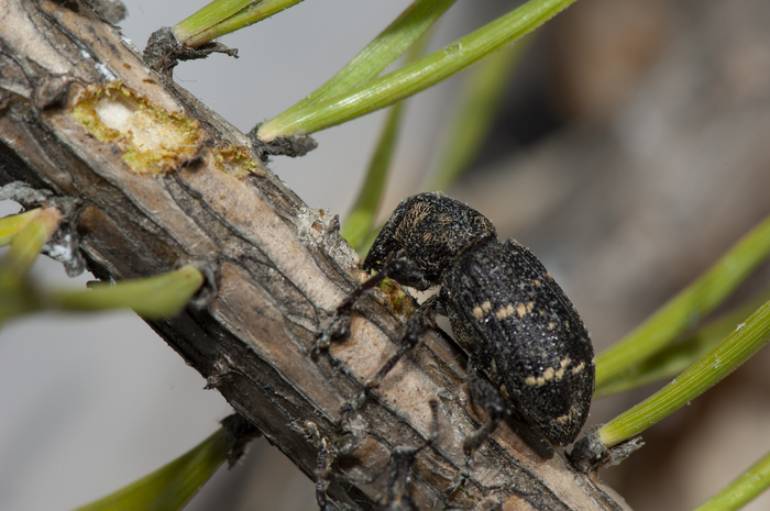 IMAGE: A LARGE PINE WEEVIL FEEDING ON SCOTS PINE. view more