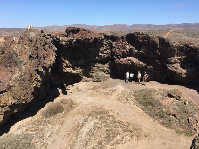 A team of researchers at the mouth of Abrigo de los Escorpiones that contains a 26-feet-(8-meter-)-deep deposit of discarded shells, animal bones and archaeological artifacts, with 97 radiocarbon dates that reveal a 12,000-year chronological history of human and raptor deposition.