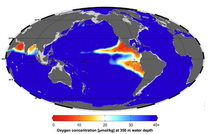 When oxygen becomes scarce, life has a hard time. This is just as true for mountain regions above 7000 meters but also for bodies of water. For example, in tropical ocean regions off of West America and West Africa and in the northern Indian Ocean, only specialized microbes and organisms with a slow metabolism such as jellyfish can survive.